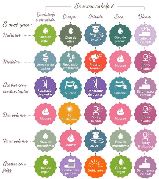 Com isso em mente vim compartilhar um tabela que encontrei recentemente e até já publiquei no instagram (@blogaromadecachos) que simplifica de uma forma bem auto explicativa o que você pode procurar em um produto de acordo com o seu tipo de cabelo e de como ele está.